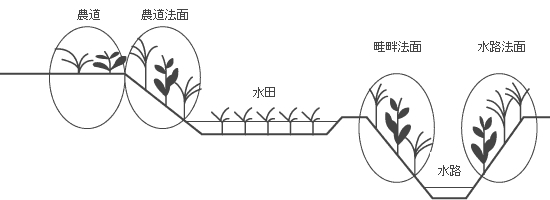- 一年生から多年生まで植生が多様な水田の大型畦畔、農道、水路などの法面(傾斜地)に使用してください。