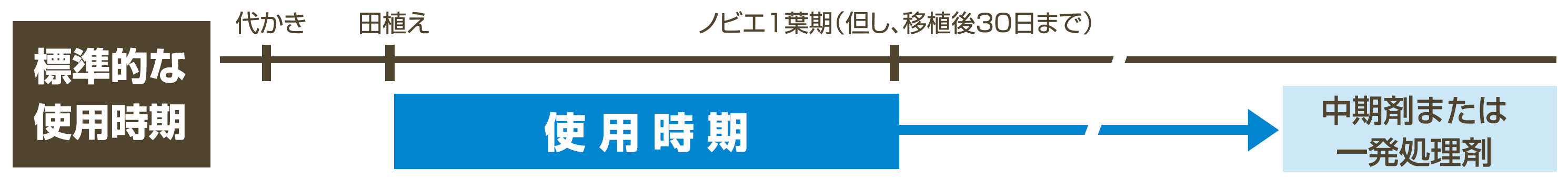 - クログワイに対しては発生期間が長く、遅い発生のものには効果を示さないので、必要に応じて有効な後処理剤と組み合わせて使用してください。