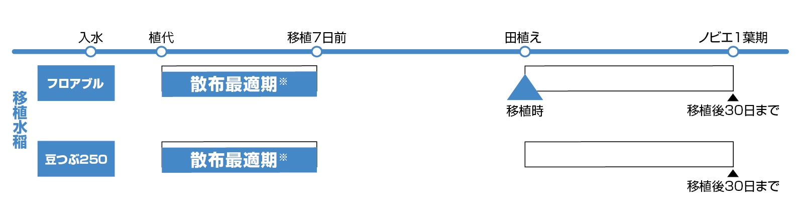 | 移植水稲 | ウリカワ オモダカ セリ ヒルムシロ ヘラオモダカ ホタルイ マツバイ ミズガヤツリ 一年生雑草 アオミドロ・藻類による表層はく離 | 500mL/10a | 植代後~移植前7日又は移植直後~ノビエ1葉期(但し、移植後30日まで) | 1回 | 原液湛水散布、水口施用又は無人航空機による滴下 | 2回以内 | 2回以内 |