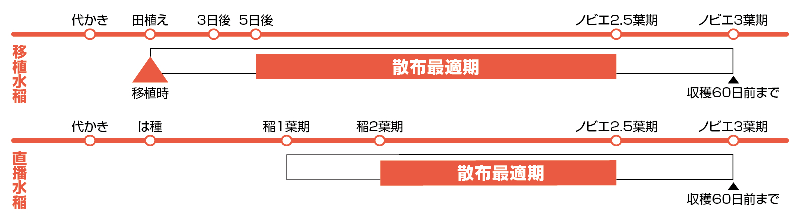 - 雑草の発生前から生育初期に有効なので、ノビエの3葉期までに、時期を失しないように散布してください。