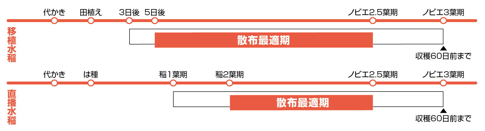 - 除草効果の低下と生育抑制の薬害が発生するおそれがあるので、入水後水持ちの安定した後に散布してください。