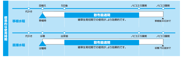 - 雑草の発生前から生育初期に有効なので、ノビエの3葉期までに、時期を失しないように散布してください。