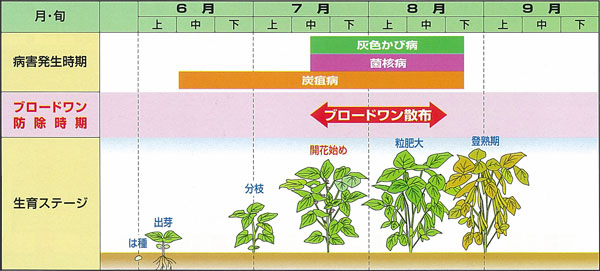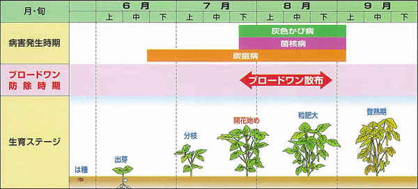 - ブロードワン顆粒水和剤はあずき、いんげんまめの菌核病・灰色かび病・炭疸病に活性を示すので、開花期の1回目の防除により菌核病・灰色かび病・炭疸病の同時防除ができます。