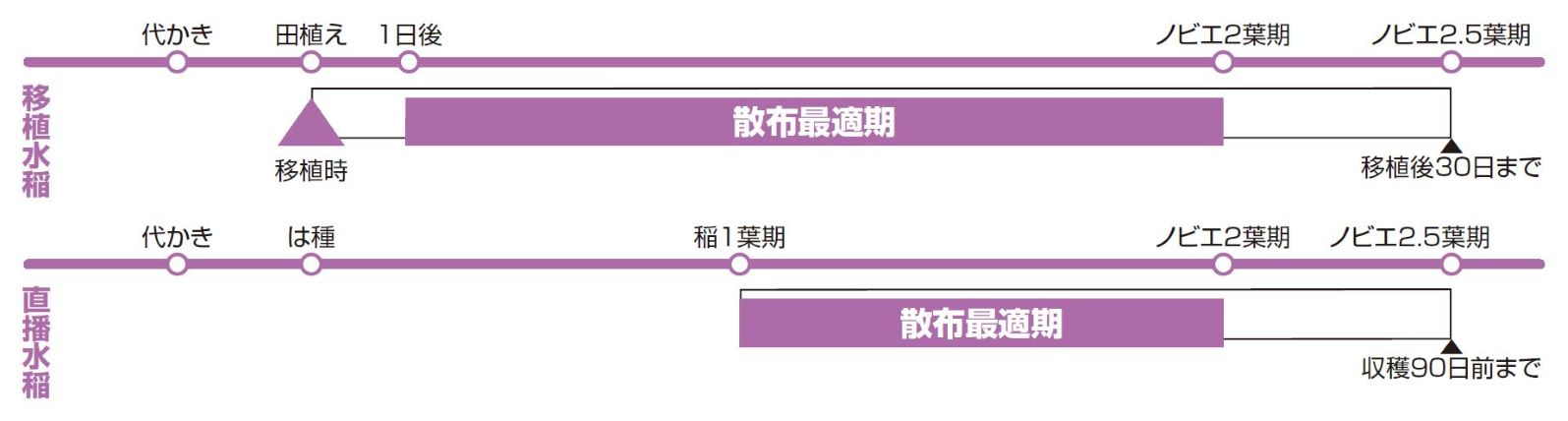 - 移植水稲では移植時からノビエ2.5葉期まで使用することができます。