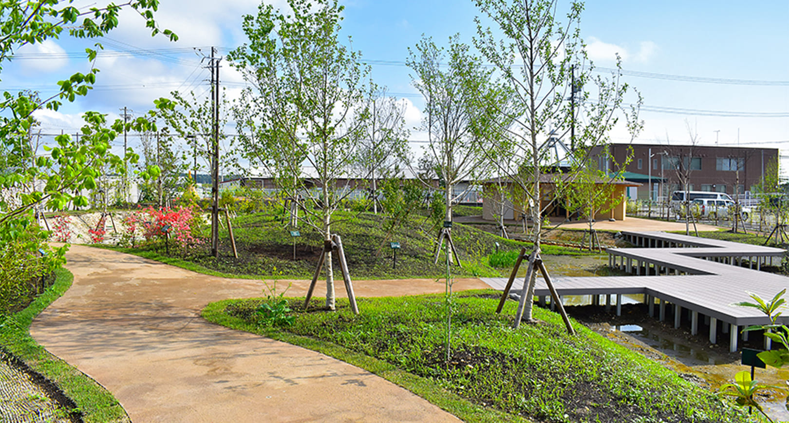 当社の具体的な生物多様性への貢献の取り組みとして、ビオトープの創設が立案され、約2年間の計画・工事期間を経て、2025年3月「クミカ レフュジア菊川」が完成しました。