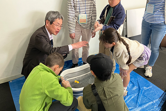 学びのフェスは、毎日新聞社主催の企業・団体の小学生向け出前授業を一堂に集めたイベントです。授業内では、豆つぶ剤の散布体験や、当社作成の農業に関するカルタなどを実施し、農業や農薬について楽しく学んでもらえる内容となっています。